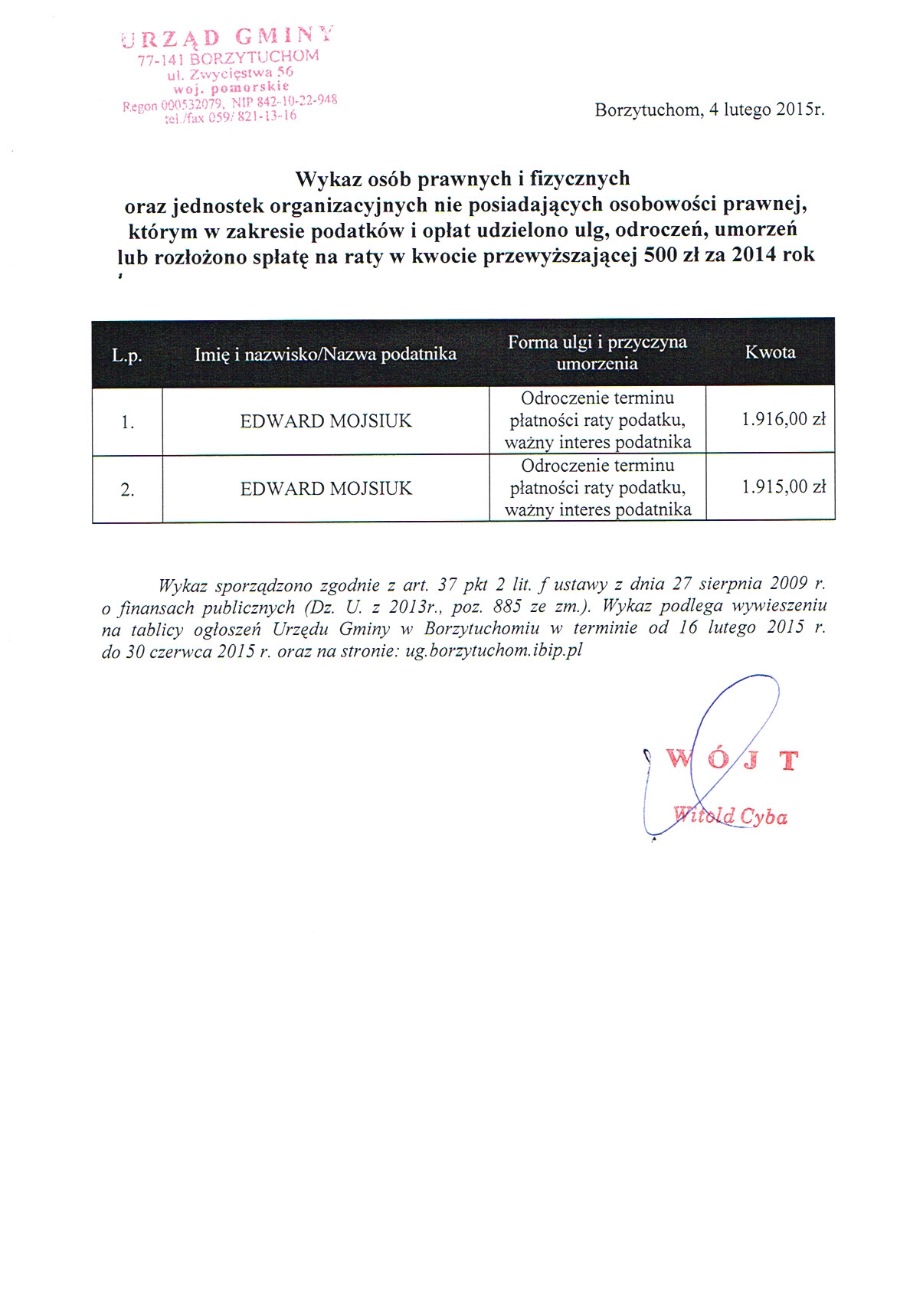 Wykaz osób prawnych i fizycznych oraz jednostek organizacyjnych nie posiadających osobowości prawnej, którym w zakresie podatków i opłat udzielono ulg, odroczeń, umorzeń lub rozłożono spłatę na raty w kwocie przewyższającej 500 zł za 2014 rok