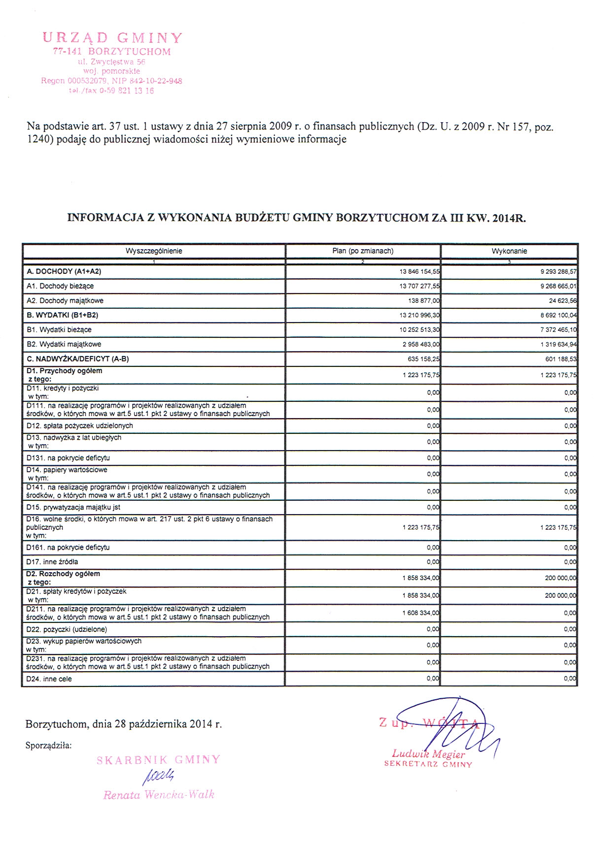 Informacja z wykonania budżetu Gminy Borzytuchom za III kwartały 2014r