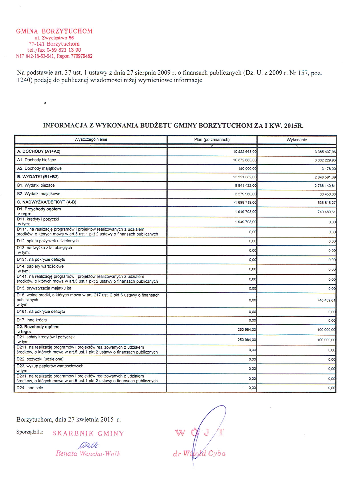 Informacja z wykonania budżetu gminy Borzytuchom za I kw. 2015r.