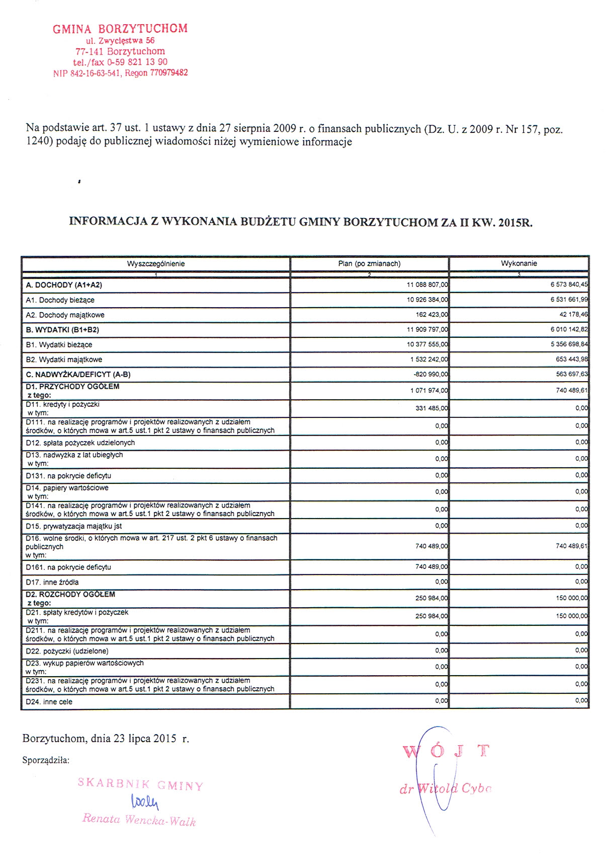 Informacja z wykonania budżetu gminy Borzytuchom za II kw. 2015r.