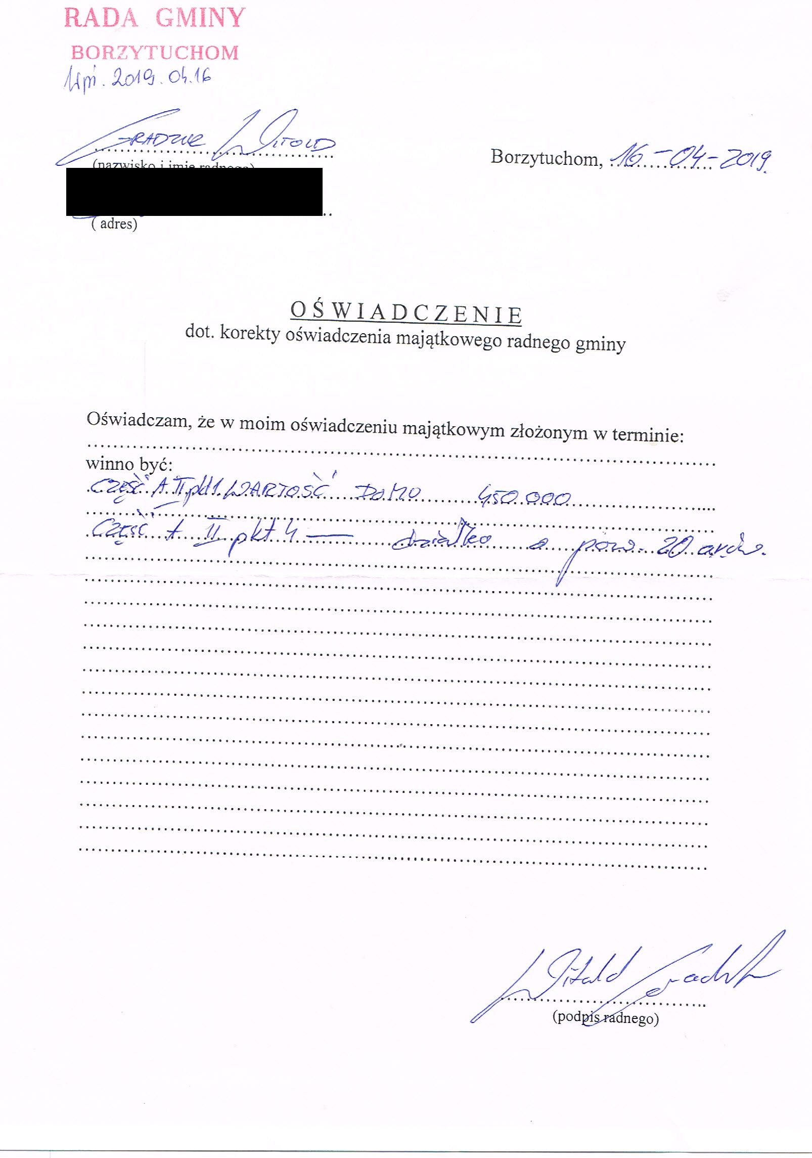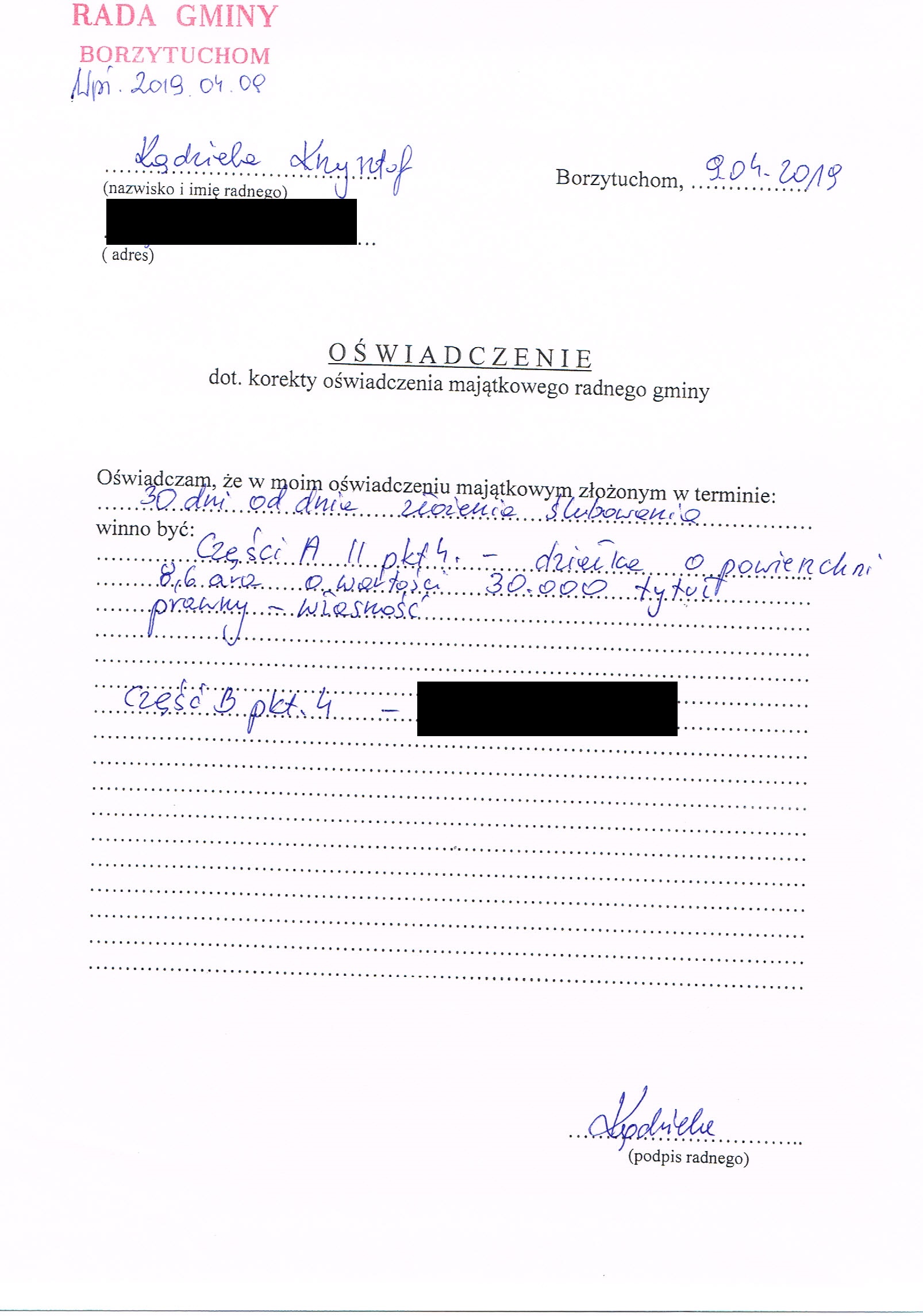 Oświadczenia majątkowe Wójta Gminy i radnych Rady Gminy Borzytuchom 30 dni po ślubowaniu